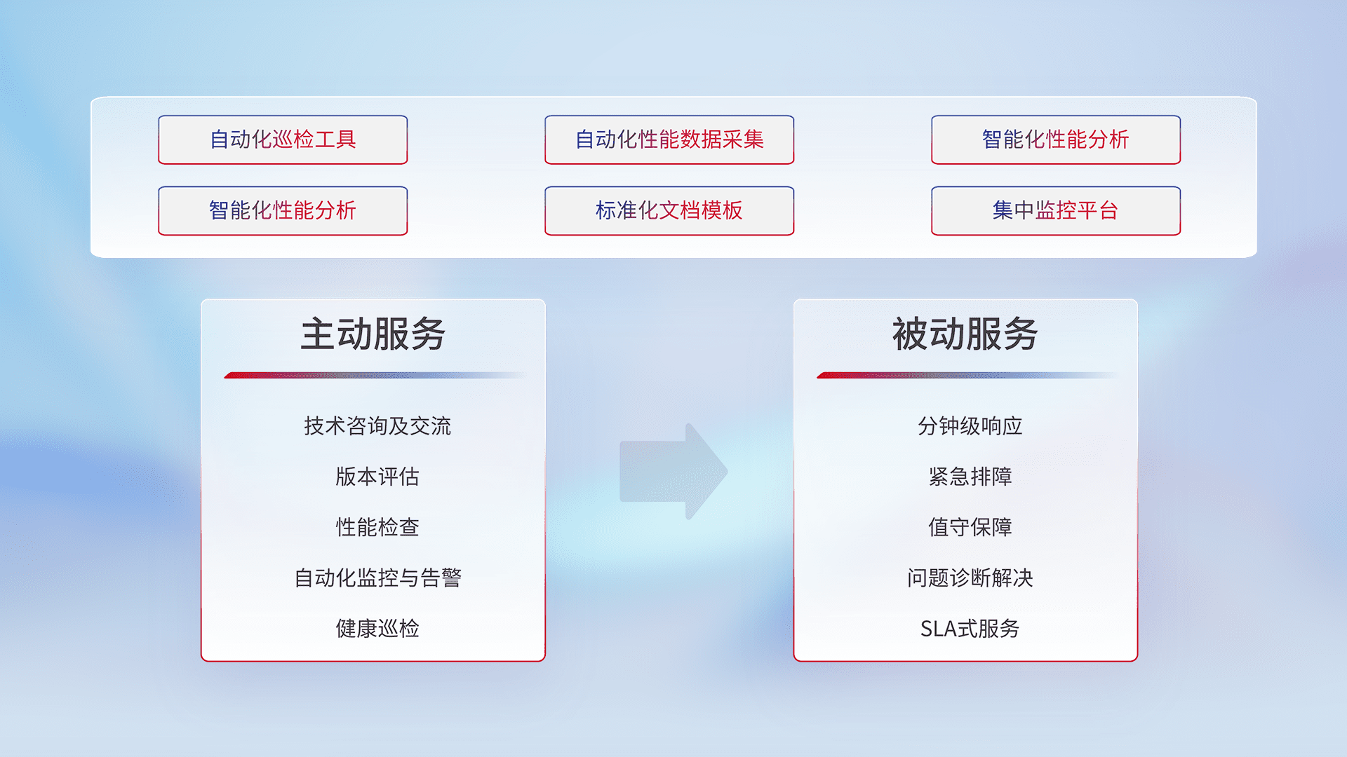智能化工具和标准化文档,,,保障服务质量,,,提供主动服务(包含技术咨询、、、、版本评估、、、、性能检查、、、、自动化监控与告警、、、健康巡检)和被动服务包含(分钟级响应、、、、紧急排障、、值守保障、、问题诊断解决、、、、SLA服务)。。。。
